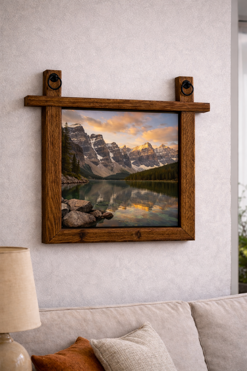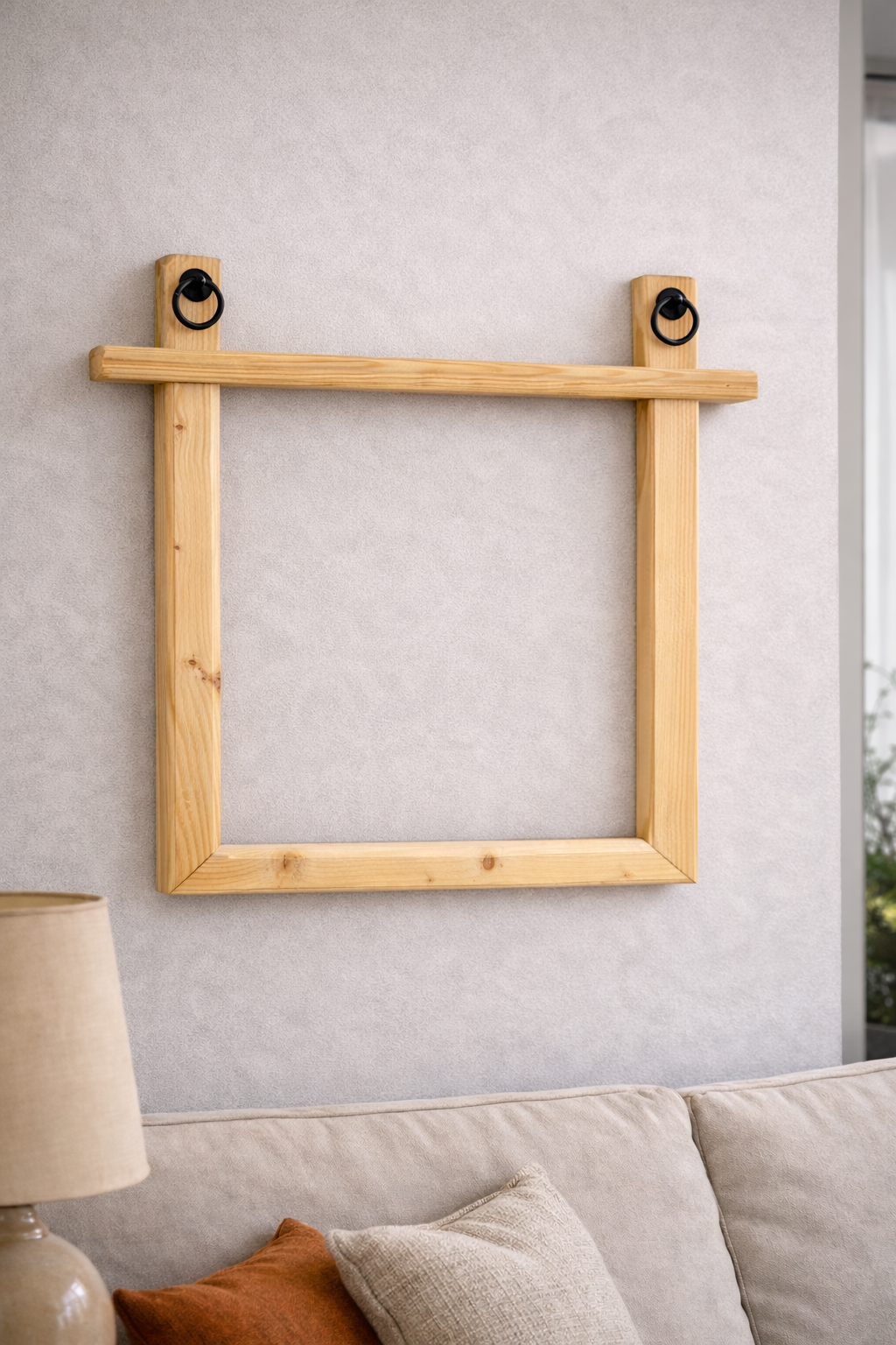 Här ser du processen i tre steg: först den råa ramen direkt efter bearbetning, sedan en färdig version med ringdetaljer, och till sist en mörk ekfinish redo att hängas upp. Den här typen av ramar finns att hitta i shoppen, och om du har speciella önskemål kan du ange dem på sidan för måttbeställt.